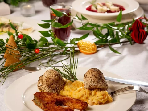 Smażone dzwonki z karpia z kapustą z grochem i ziemniakami w popiele
