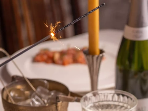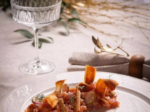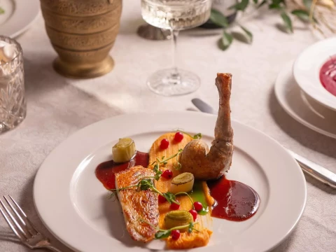 Perliczka z sosem z czerwonej porzeczki, konfitowanym porem i puré z batata