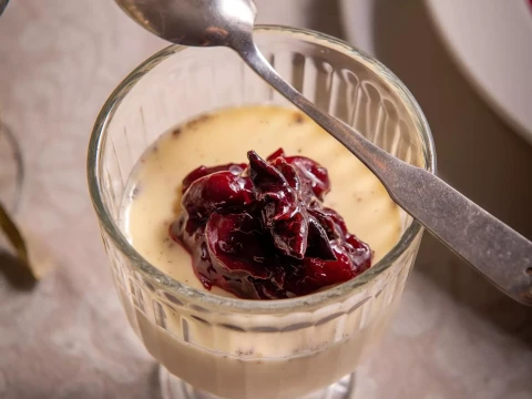 Panna cotta z białą czekoladą i dżemem z wiśni